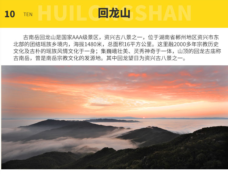 古南岳回龍山景區(qū)是國家AAA級(jí)景區(qū),2000多年前南岳在此發(fā)源,是當(dāng)時(shí)道教圣地,如今是眾多戶外攝影圣地,回龍望日更是資興的古八景色之一。