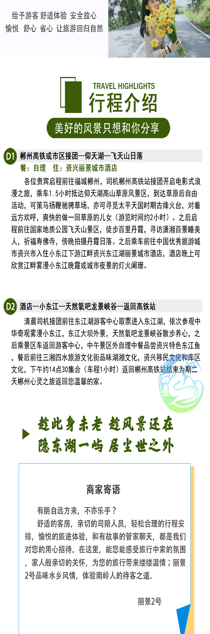 門票:仰天湖大草原門票+東江湖線路一門票+車費+飛天山景區(qū)大門票