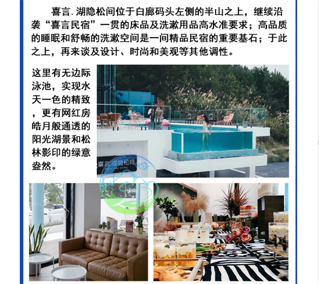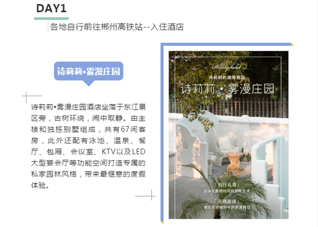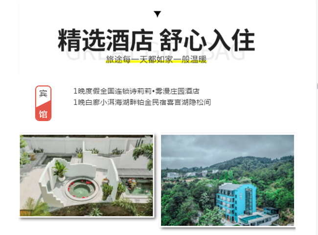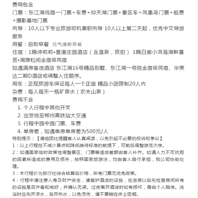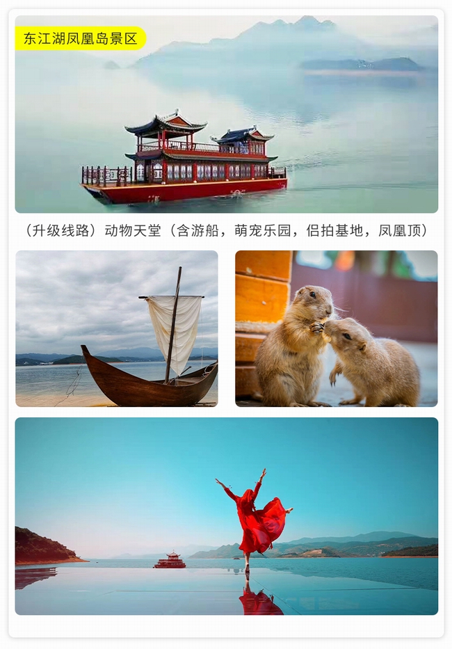 早晨酒店早餐后前往【東江湖景區(qū)】可參觀(guān)中華奇觀(guān)霧漫小東江,小東江水質(zhì)清澈明凈各項(xiàng)指標(biāo)均達(dá)到了國(guó)家一級(jí)飲用水標(biāo)準(zhǔn)。每年3-11月,每當(dāng)旭日東升或夕陽(yáng)西下,整個(gè)小東江云蒸霞蔚,朦朧縹紗,仿佛進(jìn)入仙境。之后乘車(chē)前往--東江大壩旅游碼頭。東江湖湖面面積160平方公里,湖面煙波浩淼,平均水深51米,深處達(dá)157米,蓄水量高達(dá)81.2億立方米,相當(dāng)?shù)挠诎雮€(gè)洞庭湖大,因此被譽(yù)為“湘南洞庭”,數(shù)十個(gè)島嶼星羅其中,被稱(chēng)為“東方瑞士”之后參觀(guān)【龍景峽谷景區(qū)】,峽谷內(nèi)有堪稱(chēng)南國(guó)的瀑布群--龍景十八瀑:是國(guó)內(nèi)天然氧吧!是我國(guó)目前瀑布密集最高的景區(qū),有大小瀑布26處,水潭18個(gè),是國(guó)內(nèi)罕見(jiàn)的高負(fù)離子區(qū)。中午自理中餐后前往前往江湖【白廊小洱海最美環(huán)湖公路】,沿途參觀(guān)南國(guó)生態(tài)休閑漁村,吉尼斯世界大魚(yú)鍋。東江湖環(huán)湖路共長(zhǎng)14公里是以湖光山色為主的觀(guān)景棧道,比千島湖安靜質(zhì)樸堪比美國(guó)66號(hào)公路,之后乘游船暢游大東江--登【東江湖鳳凰島】位于東江湖西北部,位于東江湖白廊片區(qū)湖的中央,是東江湖能在島頂360度觀(guān)湖景的地方。鳳凰島以“動(dòng)物天堂、人的天堂"為主題,羊駝、孔雀、王松鼠、大嘴鳥(niǎo)、獼猴、珍珠雞、火雞等諸多可愛(ài)的動(dòng)物自然放養(yǎng)其中。在這里你會(huì)有各色驚奇發(fā)現(xiàn),可愛(ài)的動(dòng)物隨時(shí)與你不期而遇。特別贈(zèng)送東江湖最火的【網(wǎng)紅打卡基地】。網(wǎng)紅攝影基地 Get網(wǎng)紅拍照地點(diǎn),輕松稱(chēng)霸朋友圈讓你享受不用排隊(duì)慢慢拍的自由。晚上晚餐自理,入住鉑金民宿喜言湖隱松間(注鉑金級(jí)為民宿最高等級(jí))