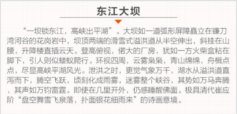 9點集合前往亞洲——東江大壩旅游碼頭。東江湖景區(qū)面積200平方公里,160平方公里的湖面煙波浩淼,平均水深51米,深處達157米,因為水體較深,所以蓄水量相當(dāng)大。達81.2億立方米的湖水晶瑩透澈,相當(dāng)?shù)挠诎雮€洞庭湖,因此被譽為“湘南洞庭”,數(shù)十個島嶼星羅其中,被稱為“東方瑞士”。到達東江大壩旅游碼頭后前往龍景峽谷景區(qū)。龍景峽谷位于東江大壩右側(cè),峽谷內(nèi)有堪稱南國大的瀑布群--龍景十八瀑;是國內(nèi)大的天然氧吧!沿途山勢陡峭,青山滴翠,古木參天,清潭、瀑布成群,是我國目前瀑布密集最高的景區(qū),有大小瀑布26處,水潭18個,是國內(nèi)罕見的高負離子區(qū)。龍呤瀑、鴛鴦瀑、東江大壩等景點,中午自行在東江大壩用中餐。