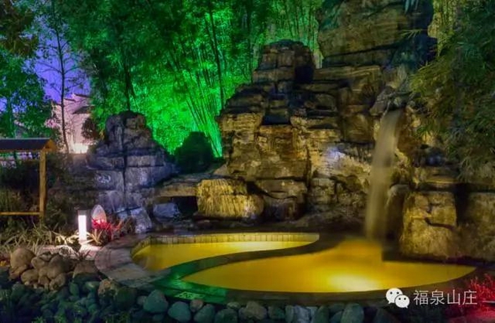 福泉山莊竹海水療為園林式露天泡浴區(qū),區(qū)內(nèi)古樂悠揚,溫泉汩汩;綠樹亭臺,曲廊回環(huán);小橋流水,水霧氤氳。