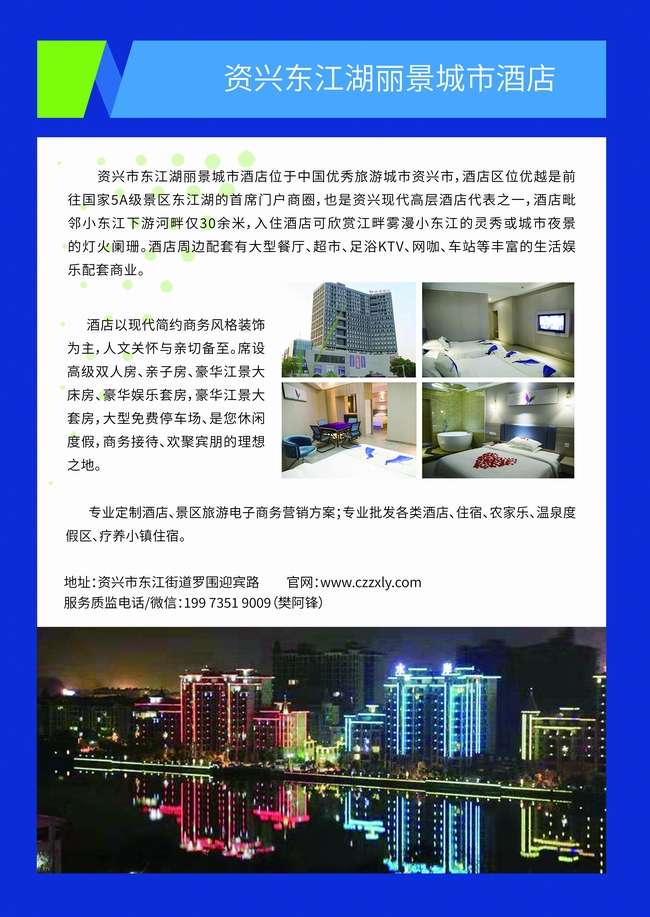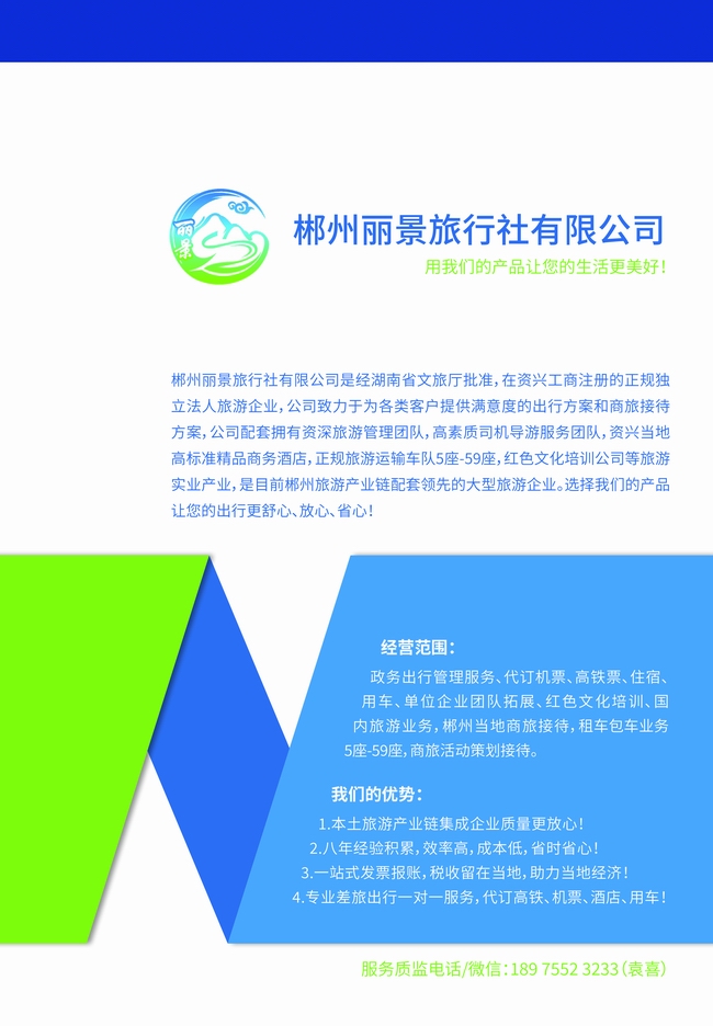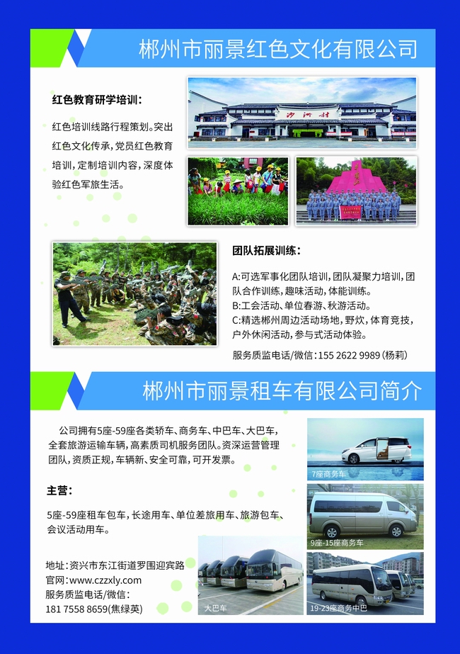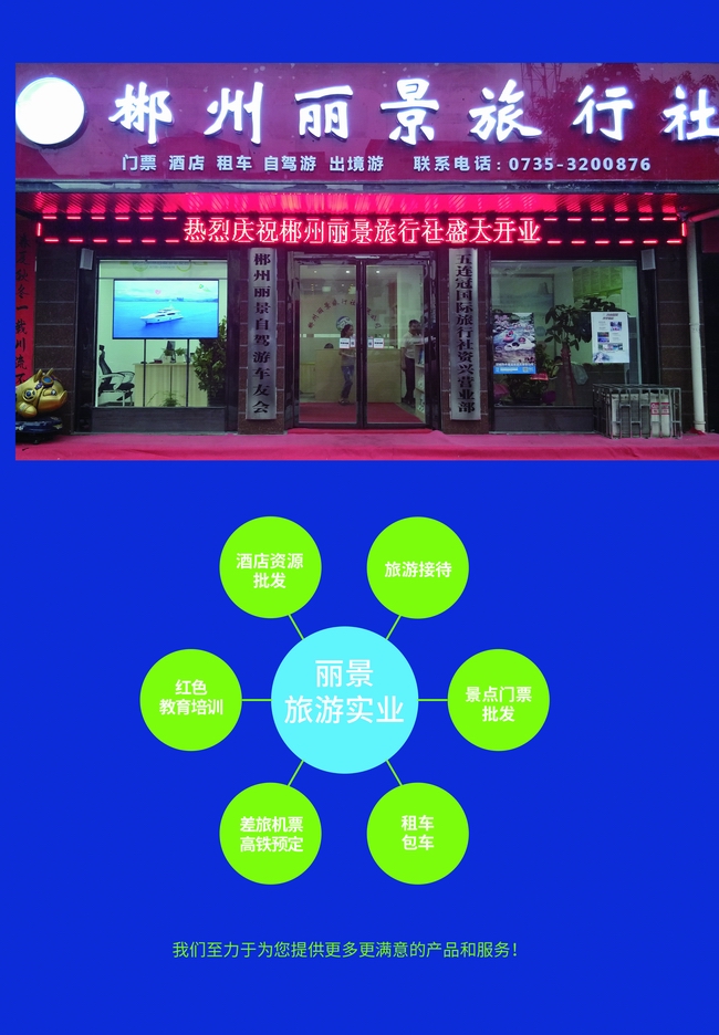 郴州麗景旅行社有限公司經(jīng)過多年誠信經(jīng)營現(xiàn)以旅行社為根基括展自有產(chǎn)業(yè):郴州市麗景租車有限公司,郴州市麗景紅色文化有限公司,資興東江湖麗景城市酒店有限公司,產(chǎn)業(yè)鏈集成企業(yè)質(zhì)量更放心,用我們的產(chǎn)品讓您的出行更美好。聯(lián)系電話18975523233