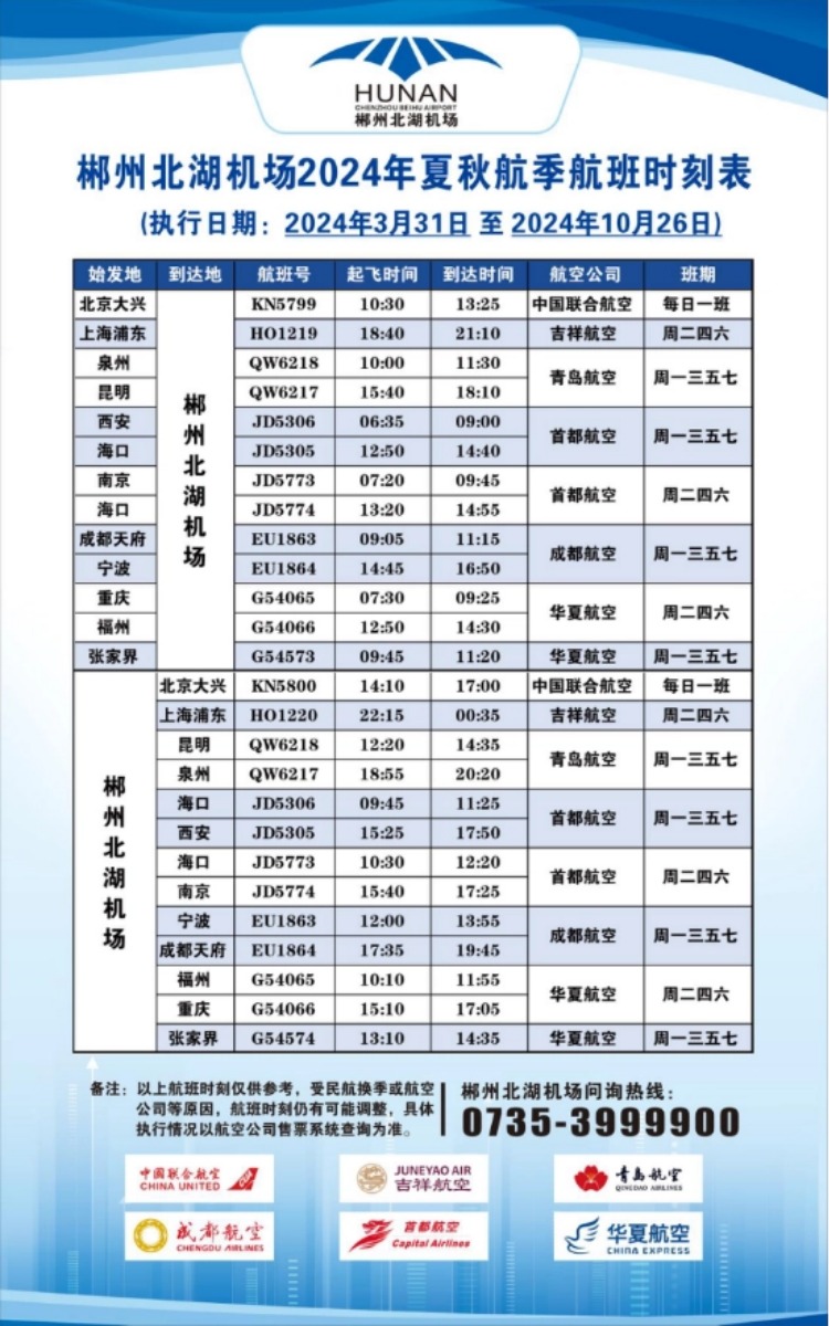 郴州旅游郴州北湖機(jī)場新增航線及2024年夏季航班時間表