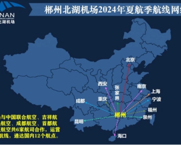自2024年3月31日(星期日)起,至10月26日止。中國民航開始執(zhí)行夏航季航班計劃。本次航班換季郴州北湖機(jī)場恢復(fù)了張家界航點(diǎn)。新航季與6家航空公司,合作運(yùn)營8條往返航線,通達(dá)國內(nèi)北京大興、上海浦東、成都天府、重慶、西安、???、南京、福州、昆明、泉州、寧波、張家界共12個航點(diǎn)。