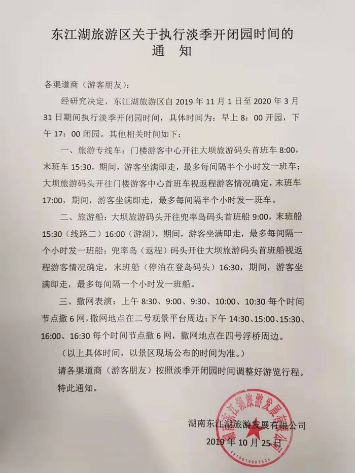 初冬11月東江湖旅游區(qū)已進(jìn)入游客接待淡季,經(jīng)研究決定東江湖旅游區(qū)于2019年11月1日至2020年3月31日期間執(zhí)行淡季開閉園時(shí)間。近期內(nèi)有意向前往東江湖景區(qū)旅游的朋友,請(qǐng)注意參照通知上的時(shí)間調(diào)整行程時(shí)間。