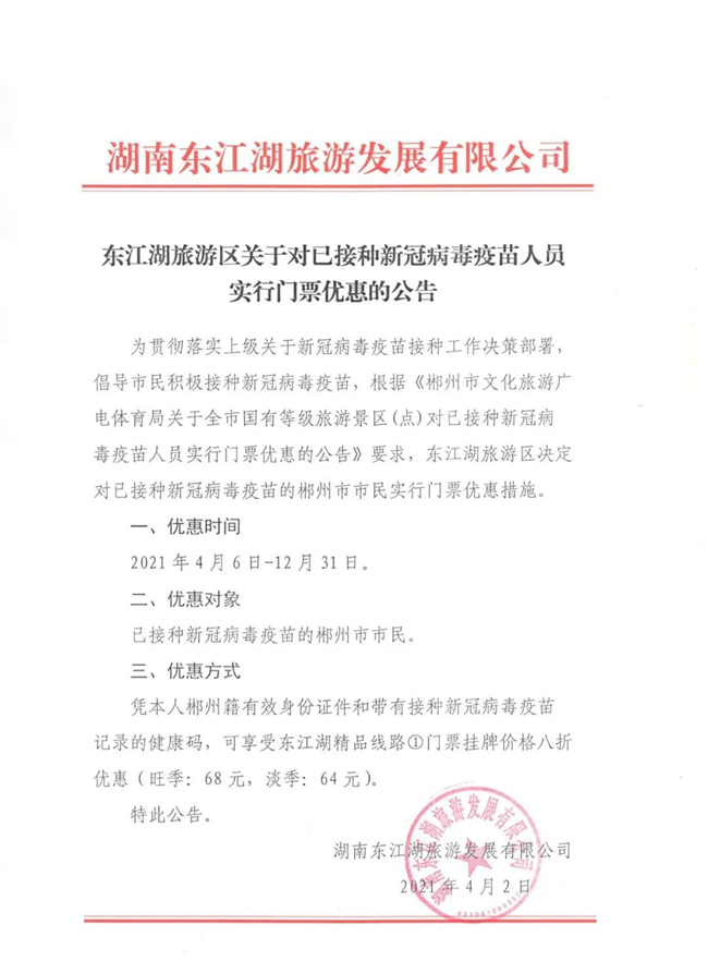 憑本人郴州籍有效身份證件和帶有接種新冠病毒疫苗記錄的健康碼,可享受東江湖精品線路①門票掛牌價(jià)格八折優(yōu)惠旺季:68元,淡季:64元)。