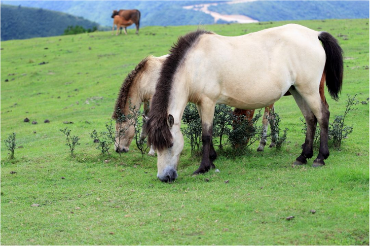 湖四周是茂盛的次原始森林,像一道天然屏障將牧場(chǎng)圍成一個(gè)世外桃源。每年春耕過(guò)后,村民便把牛馬羊放至仰天湖,任其自由自在無(wú)拘無(wú)束地生活幾個(gè)月,待入冬欲下雪時(shí)再去找回來(lái)。有時(shí),放出去的是兩頭牛,找回來(lái)時(shí)卻成了三頭,原來(lái)牛夫婦已有了愛(ài)的結(jié)晶。這種特殊的放牧方式被當(dāng)?shù)厝嗽?shī)意地叫成“漂流”。