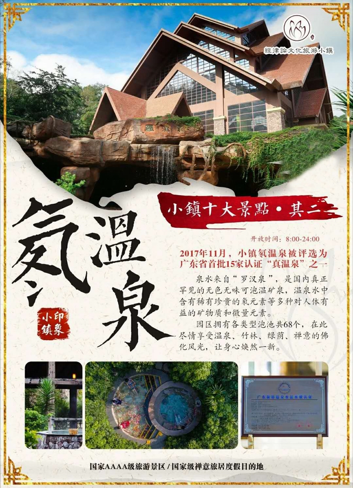 園區(qū)內(nèi)集禪修、溫泉、度假、養(yǎng)生于一體,是禪意旅居度假目的地。小鎮(zhèn)先后順利通過(guò)國(guó)家AAAA級(jí)旅游景區(qū)、廣東省文體休閑旅游服務(wù)先進(jìn)標(biāo)準(zhǔn)體系試點(diǎn)驗(yàn)收。